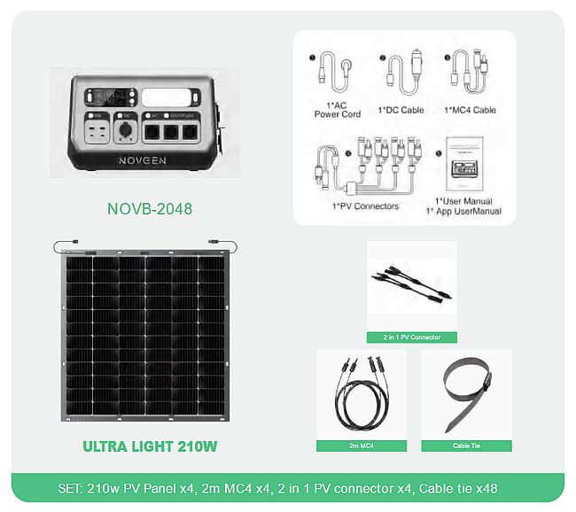 Zestaw solarny SunWave-Light Kit 800W/2048Wh zawiera elastyczny panel fotowoltaiczny i urządzenie NOVB-2048. System ten przeznaczony jest do dostarczania energii elektrycznej w miejscach gdzie nie ma dostępu do tradycyjnej sieci elektroenergetycznej, lub jako rezerwowe źródło zasilania. Elastyczny panel słoneczny (200W) nadaje się do obszarów, w których montaż tradycyjnych sztywnych paneli byłby trudny lub nieodpowiedni.